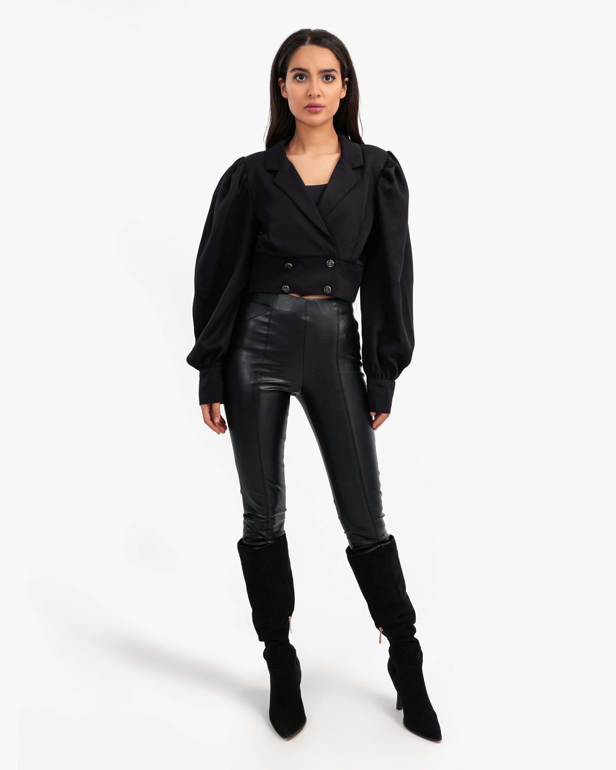 Front detail blouse. Pattern fabric. Volume puff to the sleeves with a stretch cuff and Contrast Collar Perfect for late night parties, Dates.