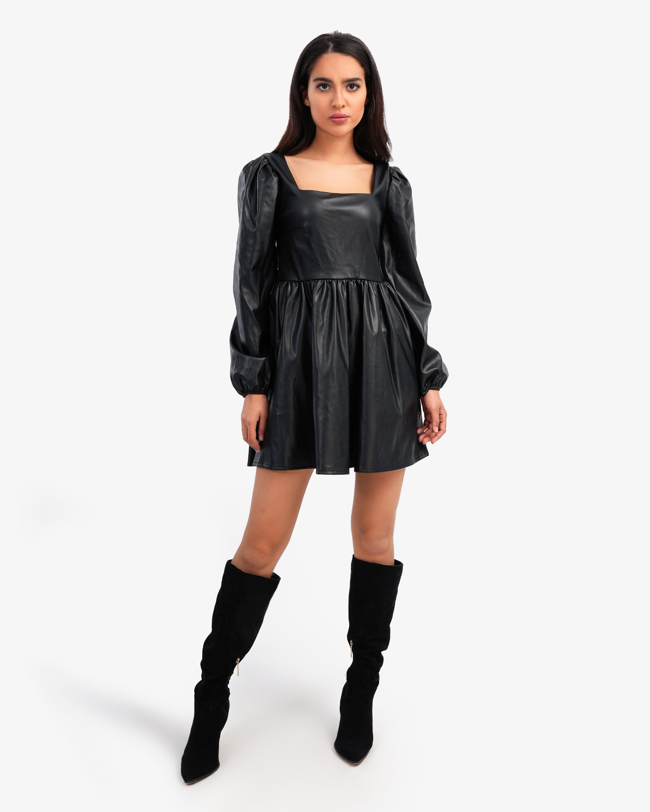 Women's Black Square Neck Chest Leather Dress Made In Turkey.