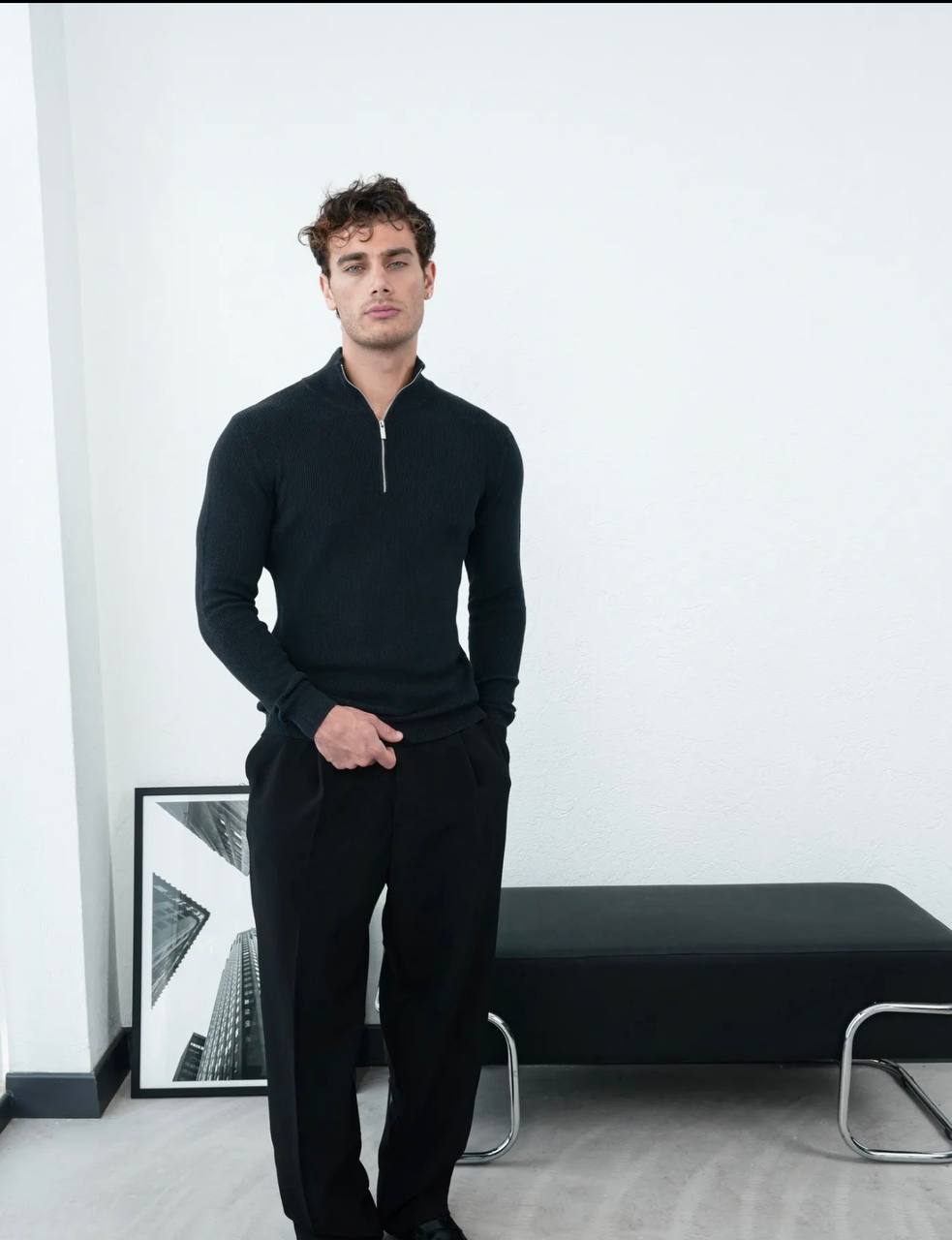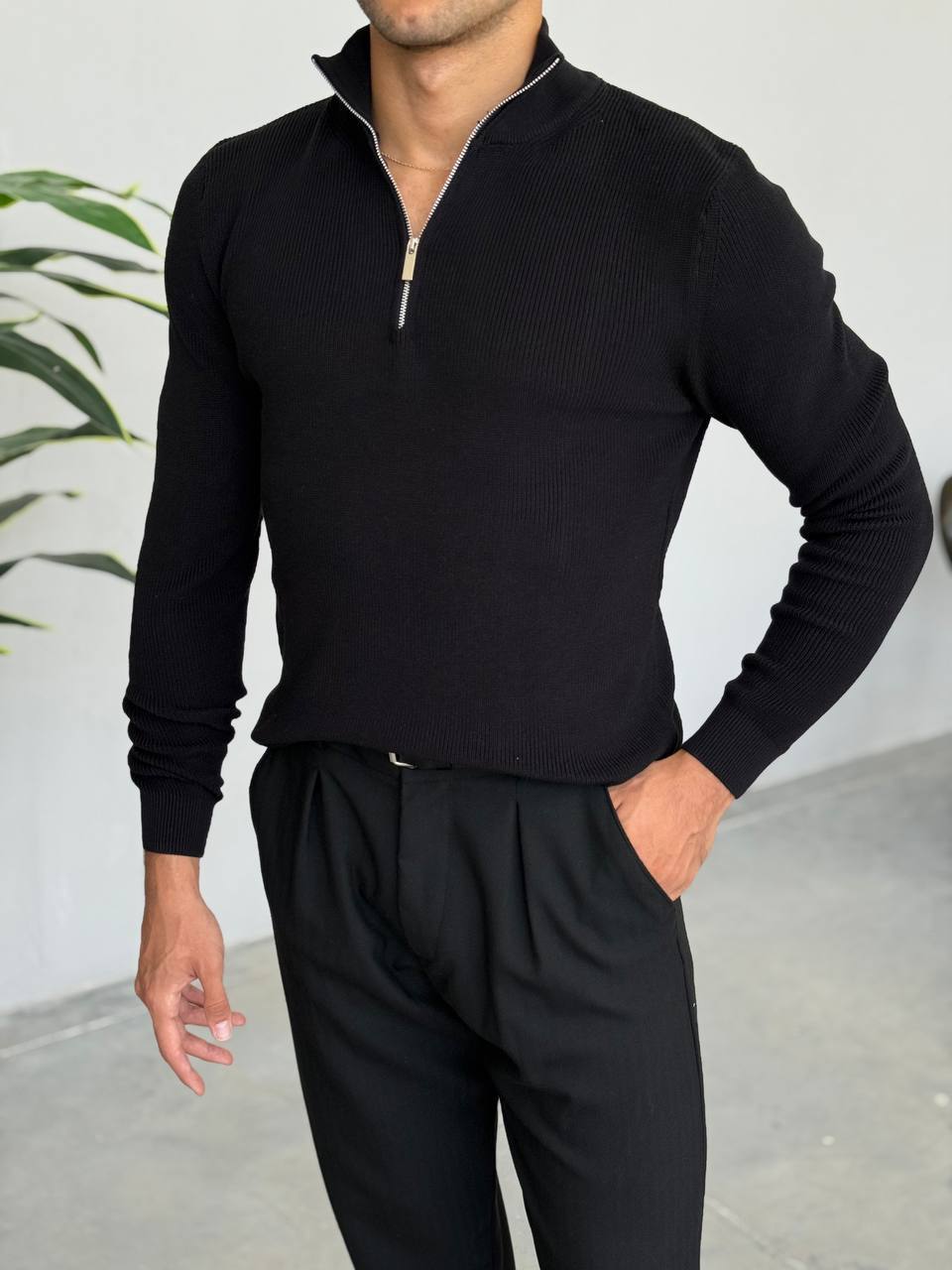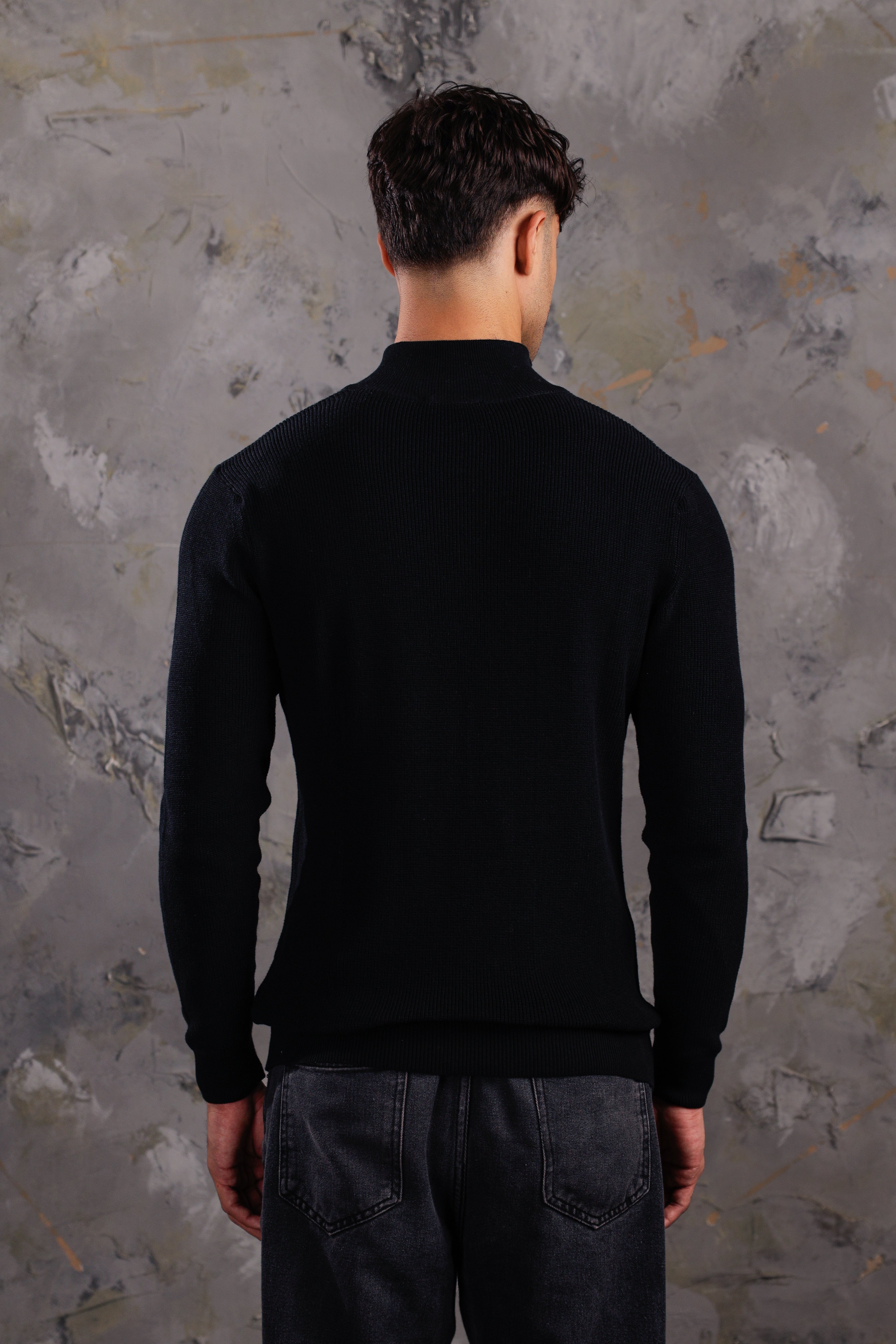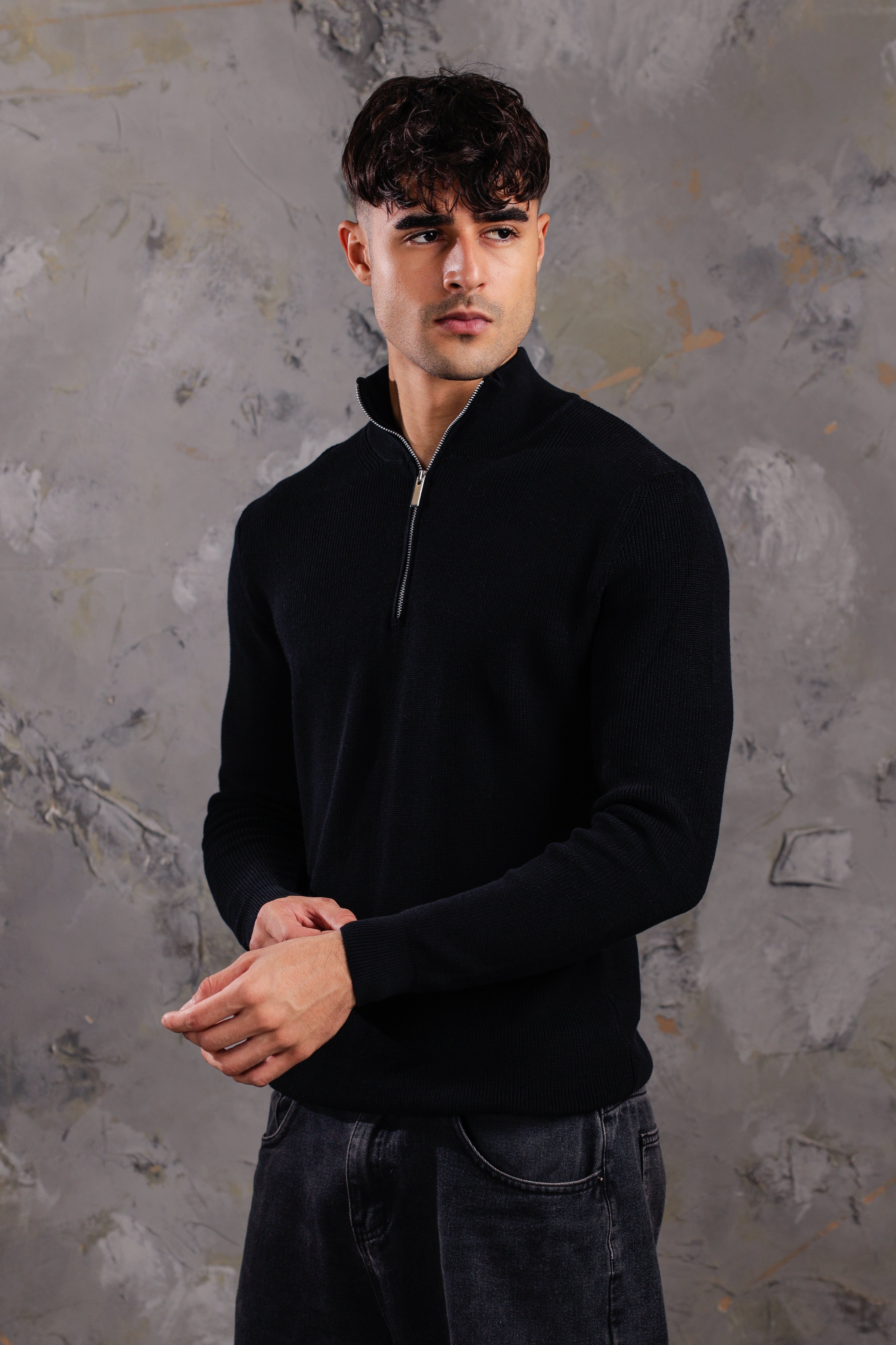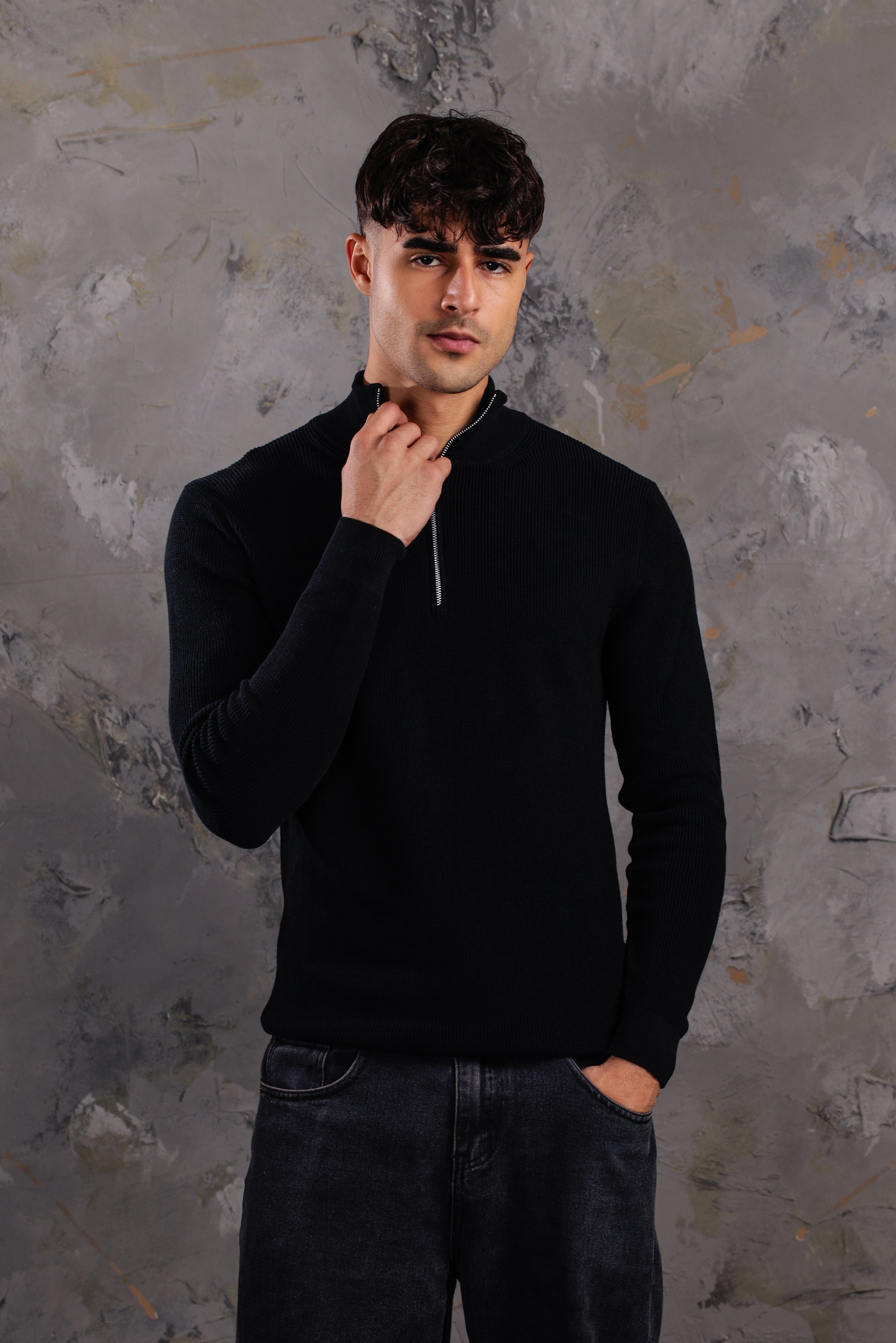 Men's Black Quarter-Zip Ribbed Knit Sweater Made in Turkey.