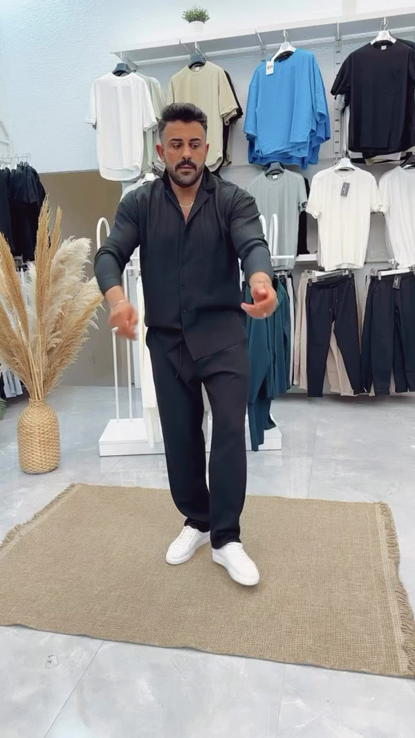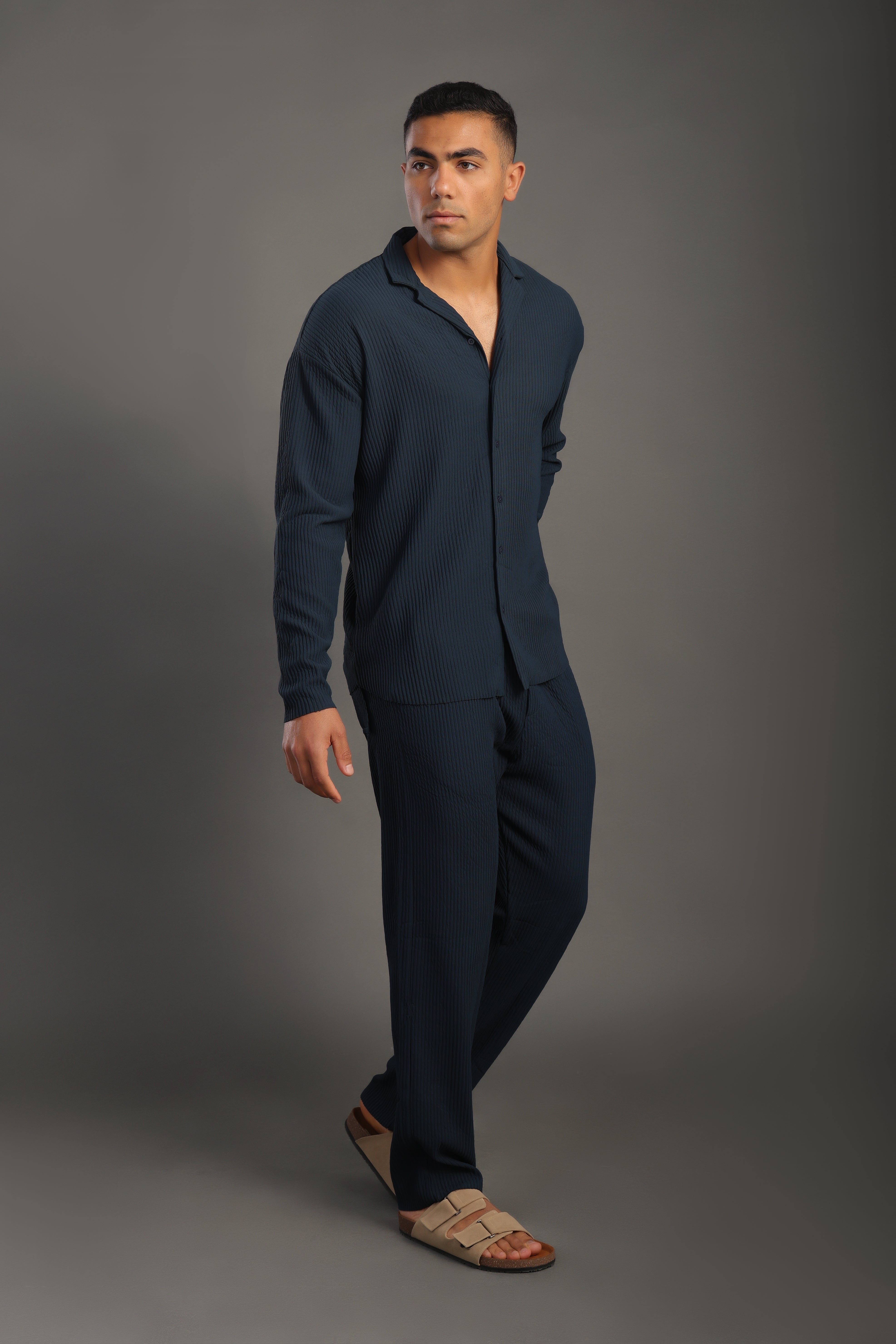 • Men's Petrol Blue Stripes Long Sleeve Pleated Shirt