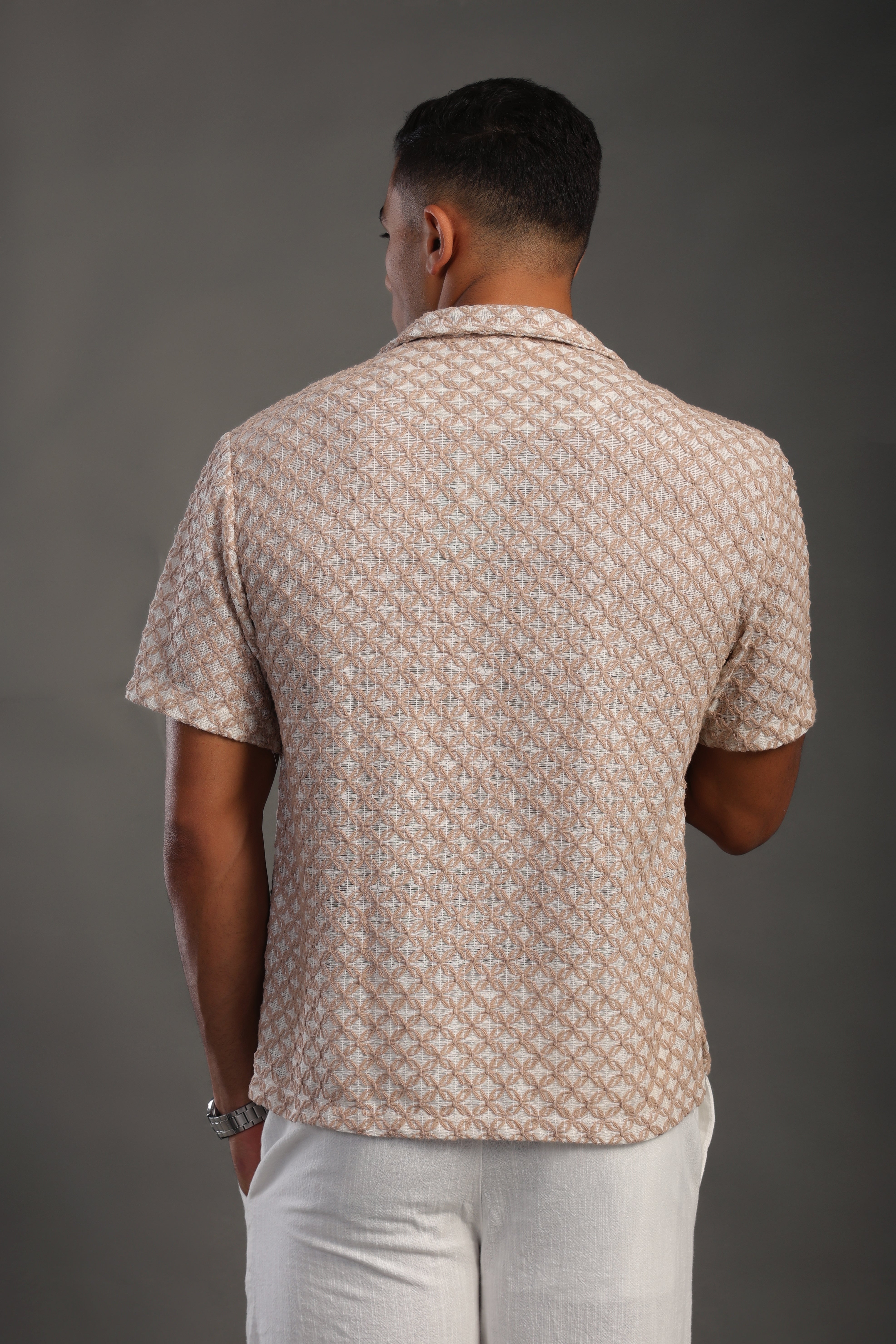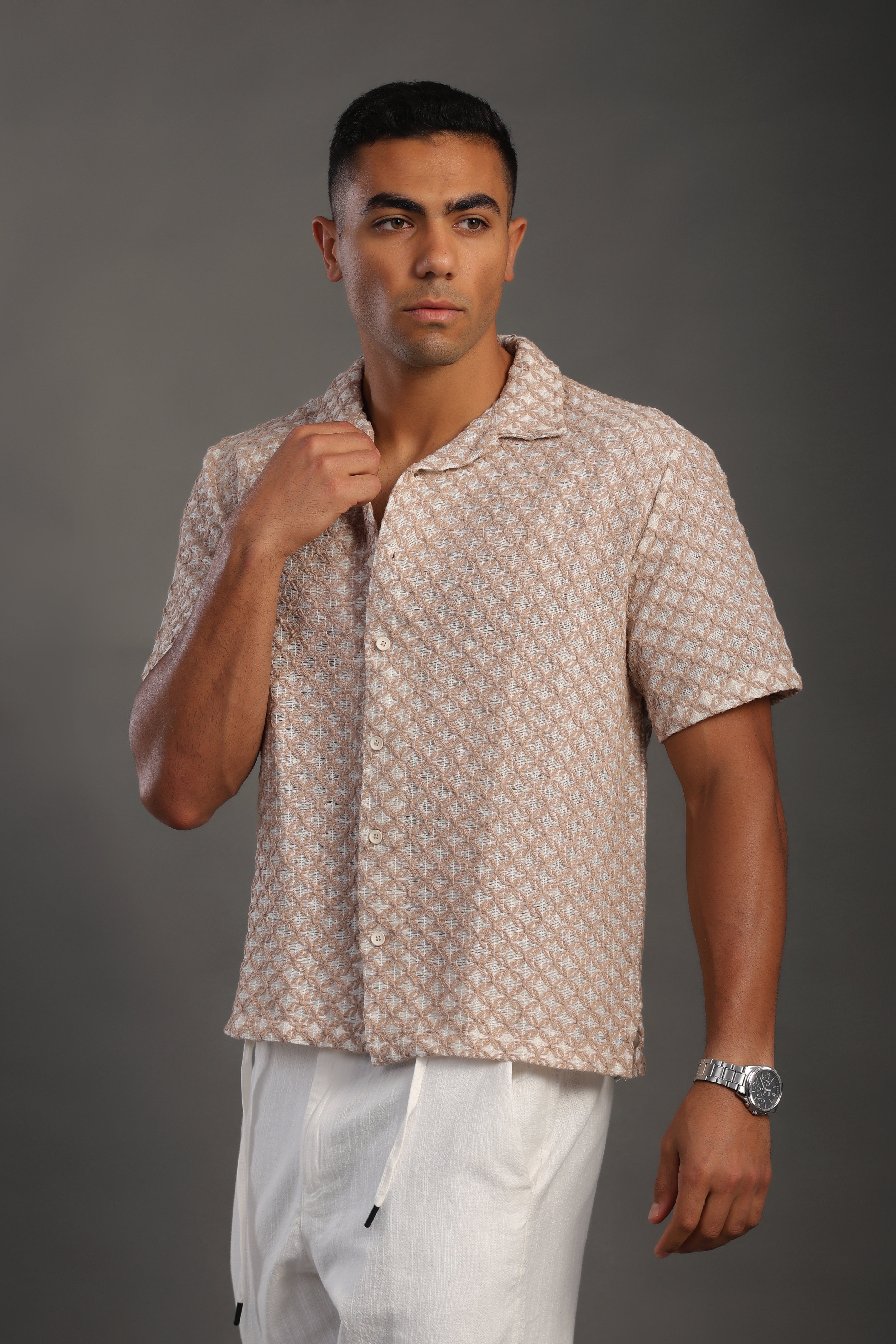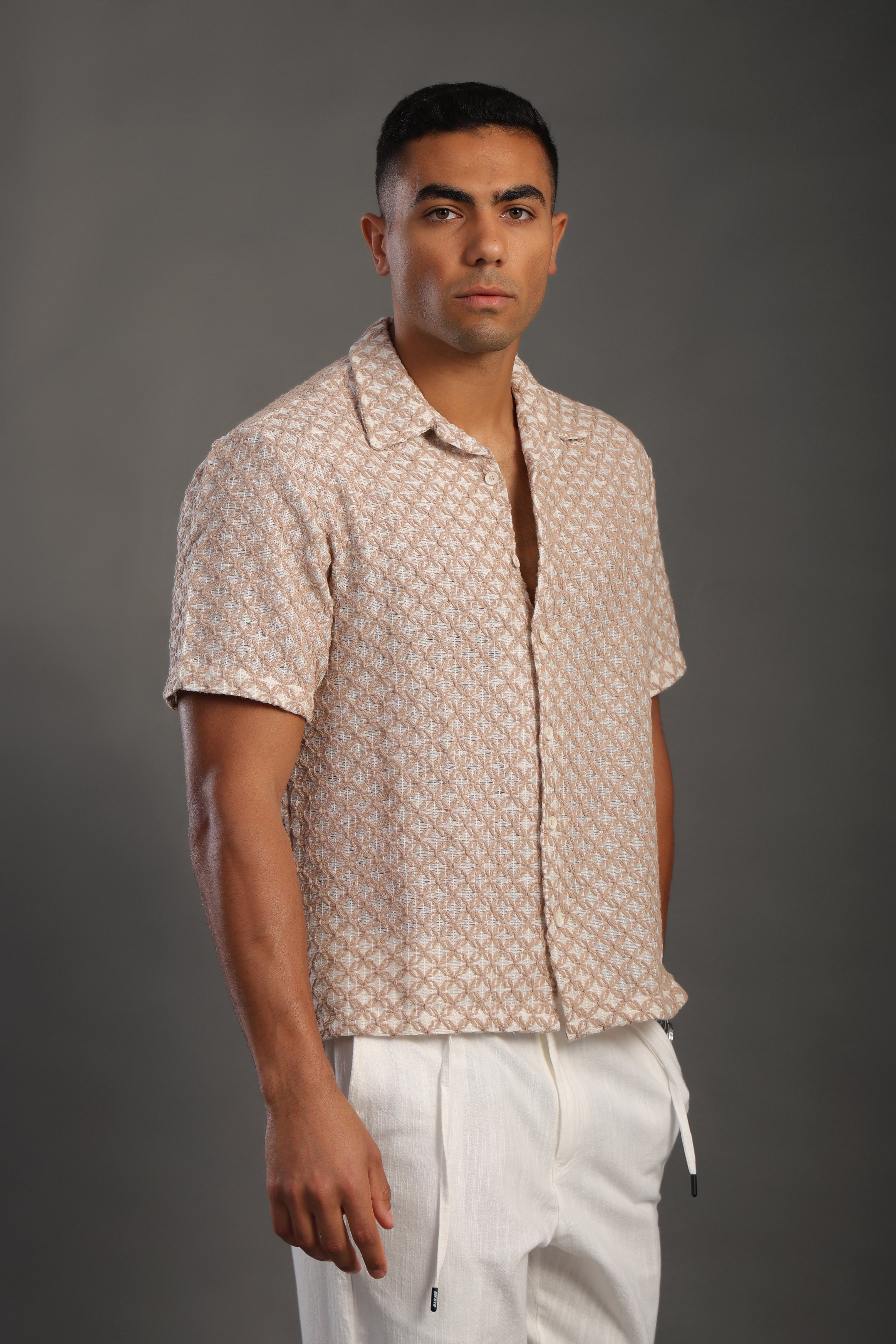 Men's Beige Half Sleeve Printed V Neck Collar Shirt Made in Turkey.