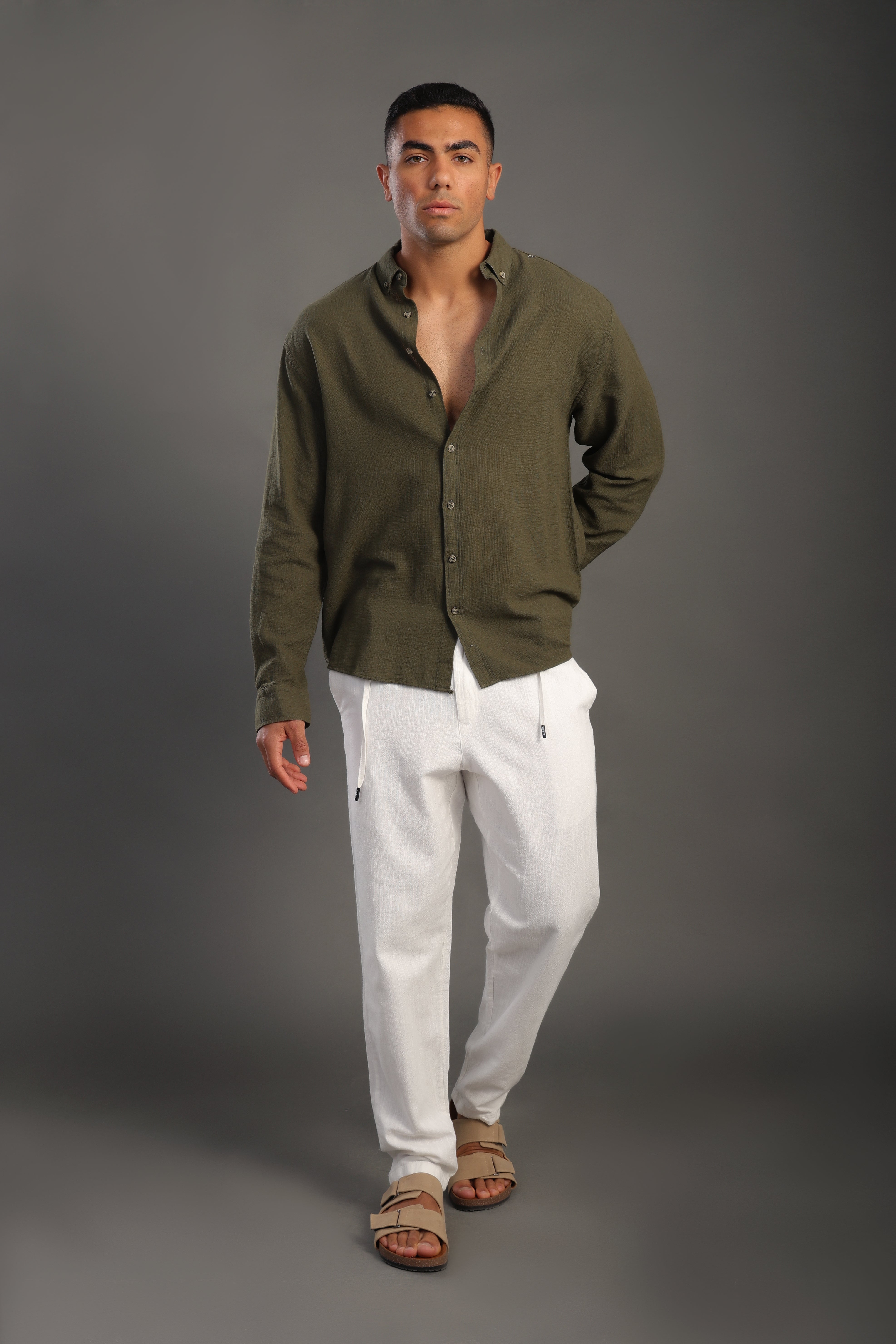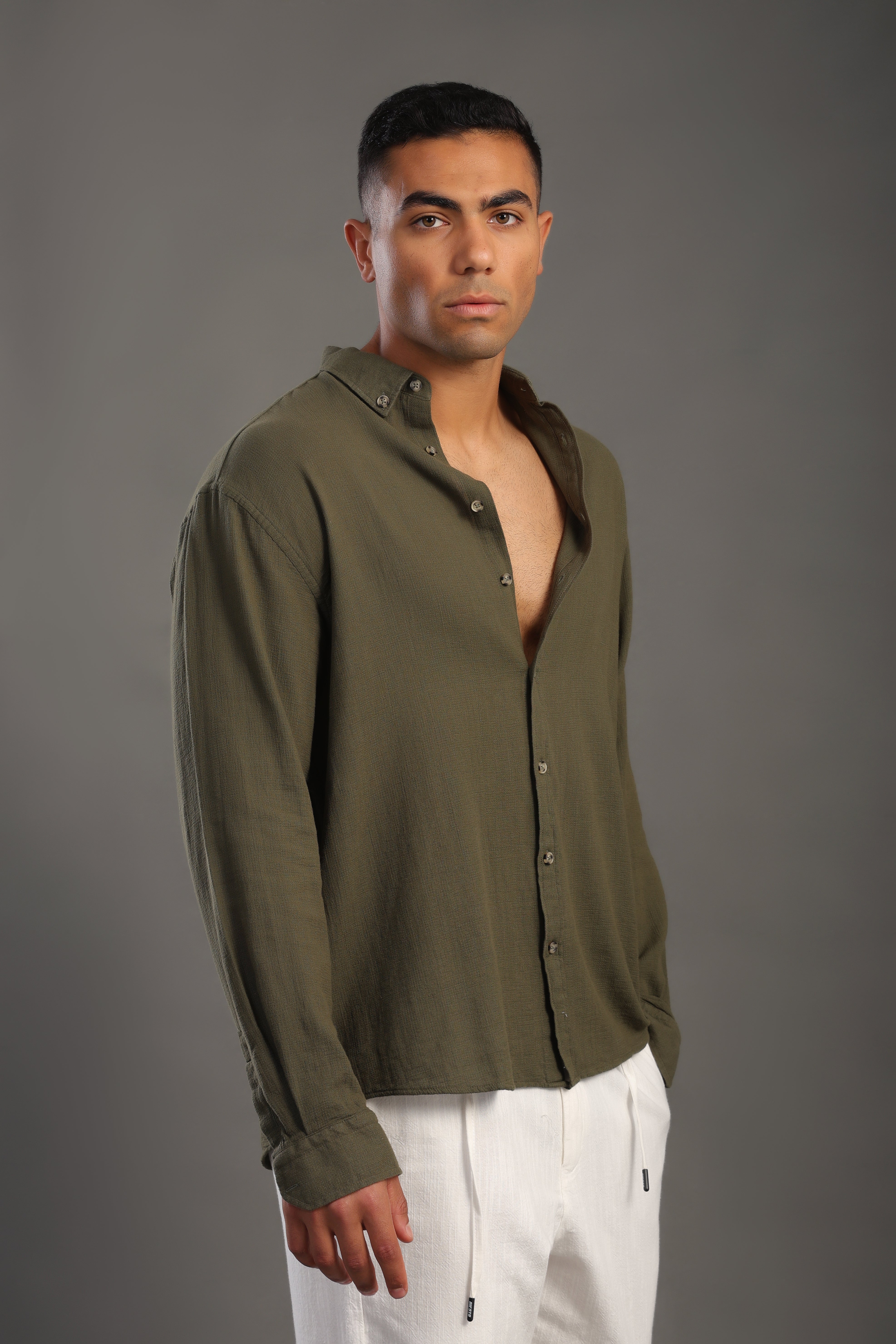 Men's Olive Green Oversize Loose Linen Shirt Made in Turkey.