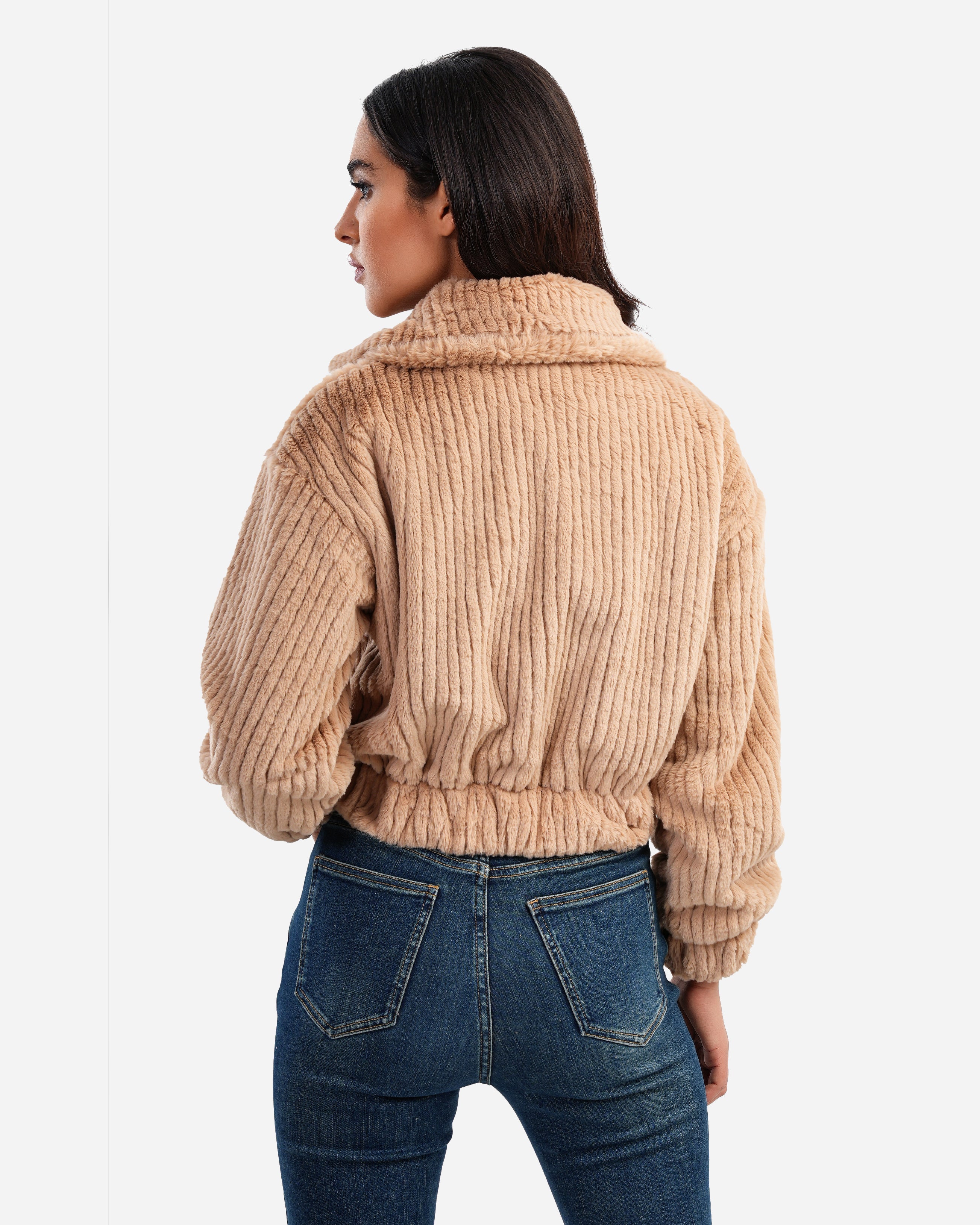 Women's Plain Fluffy Jacket In Beige Made In Turkey.